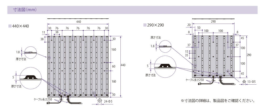 標準サイズは290mm×290mm、および440mm×440mmの2種類です。290mm×290mmサイズは16枚、440mm×440mmサイズは8枚まで連結可能です。